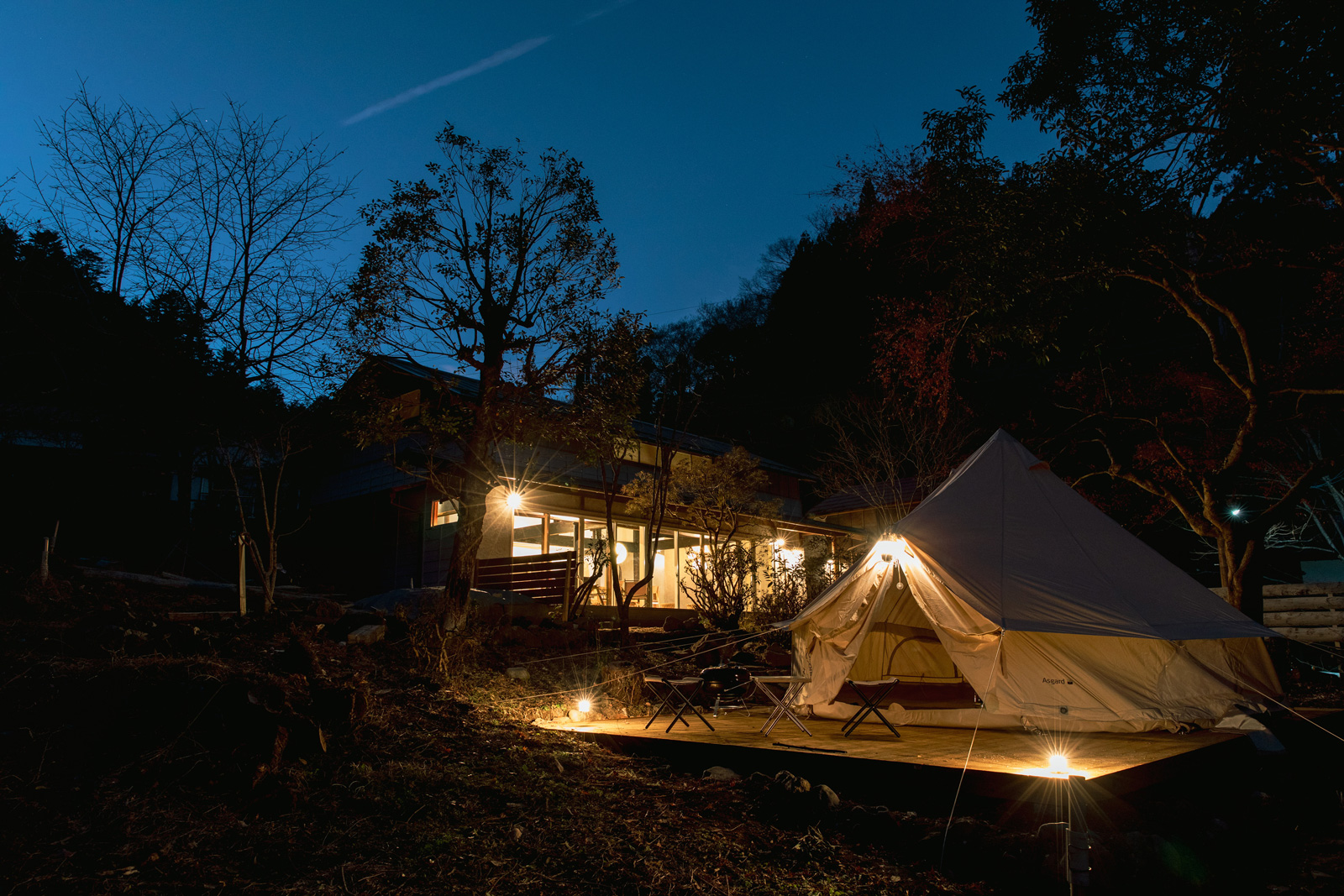 ウッドデッキに備え付けられたテントをベースにしたグランピングも可能。基本的なツールは揃っているので(一部有料)、手ぶらでバーベキューや焚き火などアウトドアライフが楽しめます。BBQプランもご用意(別料金)。